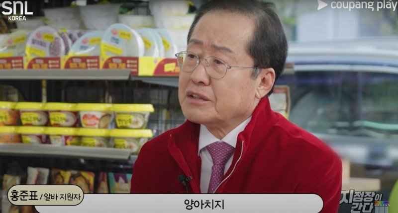 배우 지예은이 편의점 지점장으로 나와 아르바이트 지원자를 상대로 면접하는 형식으로 진행된 이 코너에서 홍 전 시장은 국민의힘 상징색인 붉은색 점퍼를 입고 나왔다.