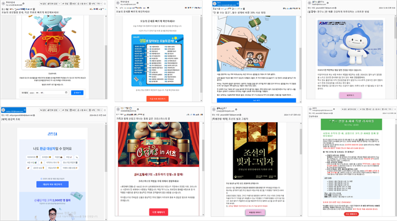 사칭 이메일은 계엄 문건을 첨부한 사례를 비롯해 북한 신년사 분석, 정세 전망, 유명 가수 콘서트 초대장 등 다양한 형태로 발송됐다. 이메일에는 링크가 포함돼 있었으며, 이를 클릭하면 로그인을 요구하는 화면으로 연결돼 포털사이트 아이디와 비밀번호 입력을 유도하는 수법이 사용됐다.