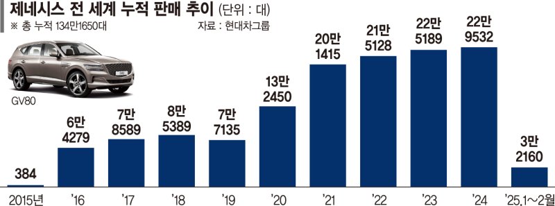 14일 현대차에 따르면 제네시스의 올해 2월 기준 해외 시장 누적 판매는 46만4059대를 기록했다. 제네시스의 연간 해외 판매가 10만대 수준인 점을 고려하면 브랜드 출범 10주년을 맞이하는 올 11월 전에 누적 50만대를 넘어설 것으로 보인다. 국내 판매량을 포함한 총 누적 판매대수는 134만1650대이며, 11월에는 150만대를 돌파할 전망이다.