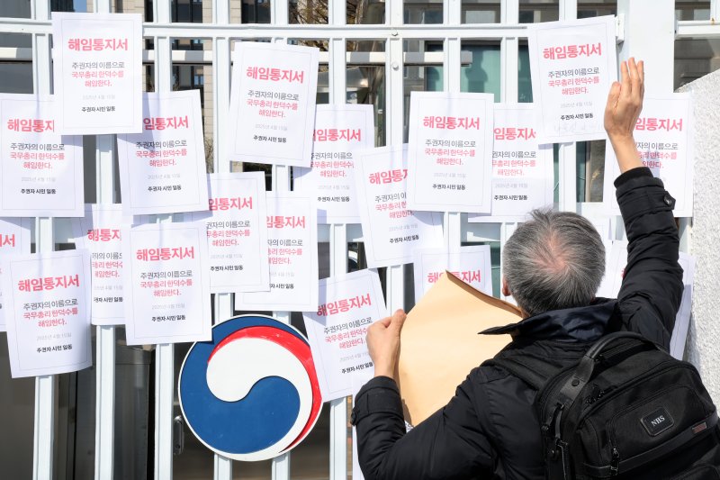 이지현 참여연대 사무처장은 "한 총리가 대행하는 자리는 국헌문란을 목적으로 내란을 일으켜서 파면당한 대통령의 자리"라며 "당장 직무에서 물러나서 내란 수사를 받아도 마땅한 자가 헌재의 파면 결정에 정면으로 불복하는 위헌·위법한 행위를 하고 있다.