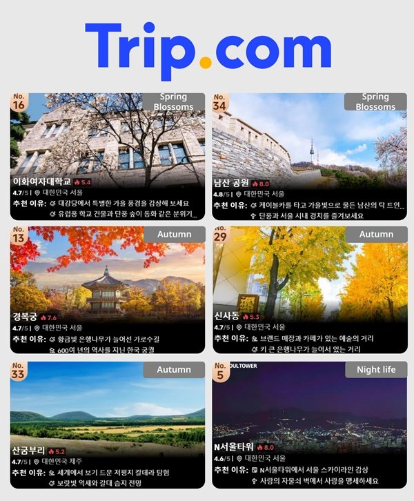 홍종민 트립닷컴 한국 지사장은 "트립.베스트는 글로벌 관광객의 리뷰 수백만 건과 실제 예약 데이터를 기반으로 선정된 만큼 관광객이 어떤 경험을 선호하는지를 명확히 보여준다"며 "한국은 계절별 자연, 미식, 로컬 체험 등 다양한 분야에서 경쟁력을 보여 세계 여행 시장에서 존재감을 키워가고 있다"고 설명했다.