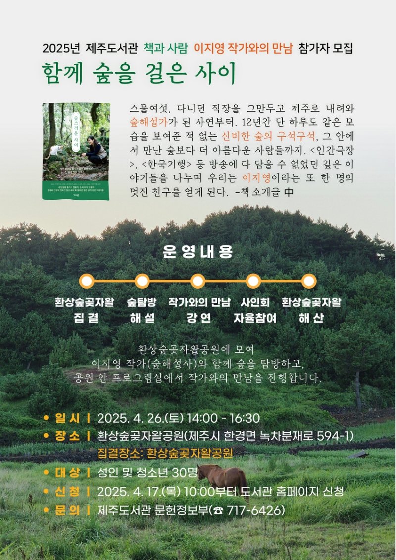 신비한 숲에서 만난 숲보다 더 아름다운 사람들과의 이야기를 담은 '숲스러운 사이'(가디언)를 쓴 이지영 작가와 함께 숲을 탐방하고 이야기를 나누는 프로그램이다.