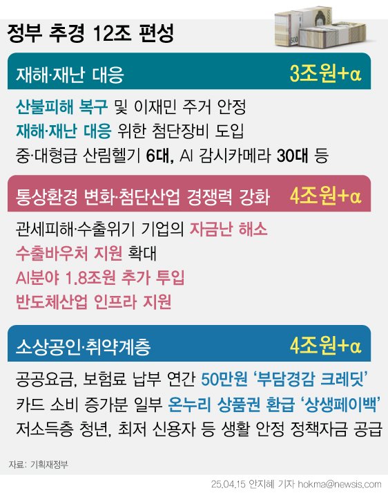 [세종=뉴시스] 안호균 기자 = 정부가 당초 계획보다 2조원가량 늘어난 12조원 규모의 추가경정예산(추경)안을 편성하고 다음 주 국회에 제출한다. 경제·민생의 어려움과 영남권 산불 복구의 시급성 등을 고려해 규모를 당초 계획보다 증액했다.
