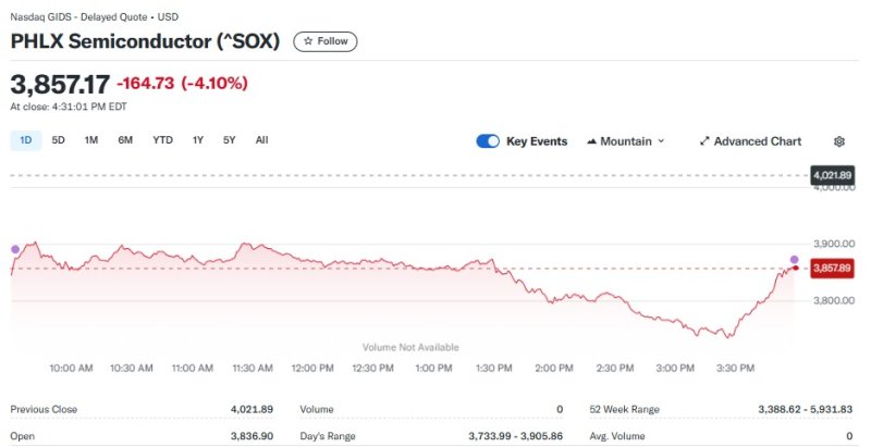 16일(현지시간) 뉴욕증시에서 반도체지수는 4.10% 급락한 3857.17포인트를 기록했다. 이로써 4000선이 또다시 붕괴했다.