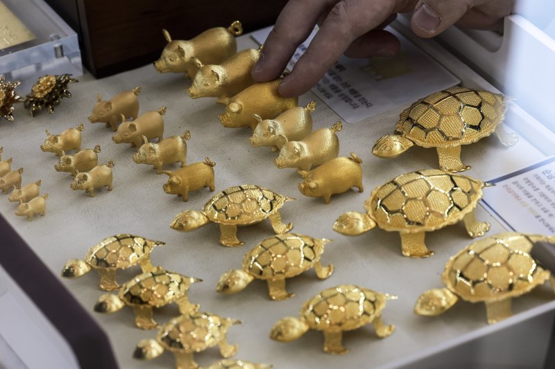 이는 도널드 트럼프 미국 대통령의 관세 정책으로 미·중 무역갈등이 격화되고 경기 침체 우려로 인한 금리 인하 기대가 확대되며 안전자산인 금값이 꾸준히 상승하는 것으로 풀이된다.
