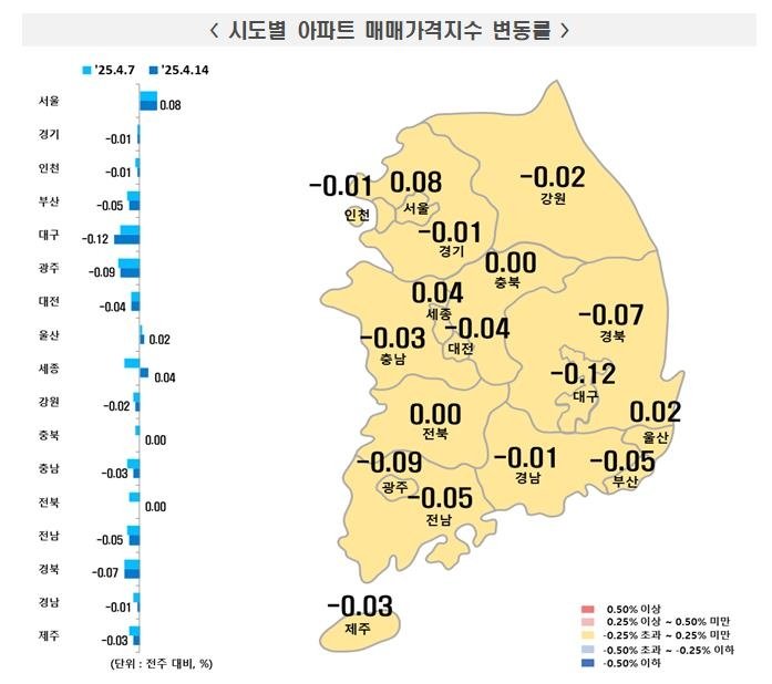 다만 지방(-0.05→-0.04%), 5대 광역시(-0.06→-0.06%), 8개도(-0.05→-0.03%) 등은 하락세를 지속해 서울과 지방 간 집값 양극화가 심화하는 모습이다.
