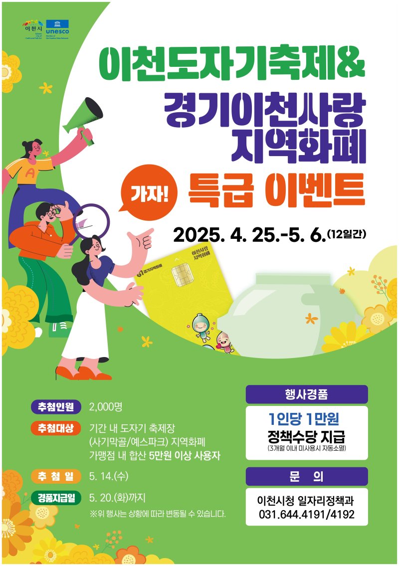 17일 이천시에 따르면 시는 도자기축제 기간인 25일부터 5월 6일까지 축제장(예스파크, 사기막골) 내 가맹점에서 합산 5만 원 이상의 지역화폐를 사용한 시민들을 대상으로 5월 14일 무작위로 2000명을 추첨해 정책 수당 1만 원을 지급한다.