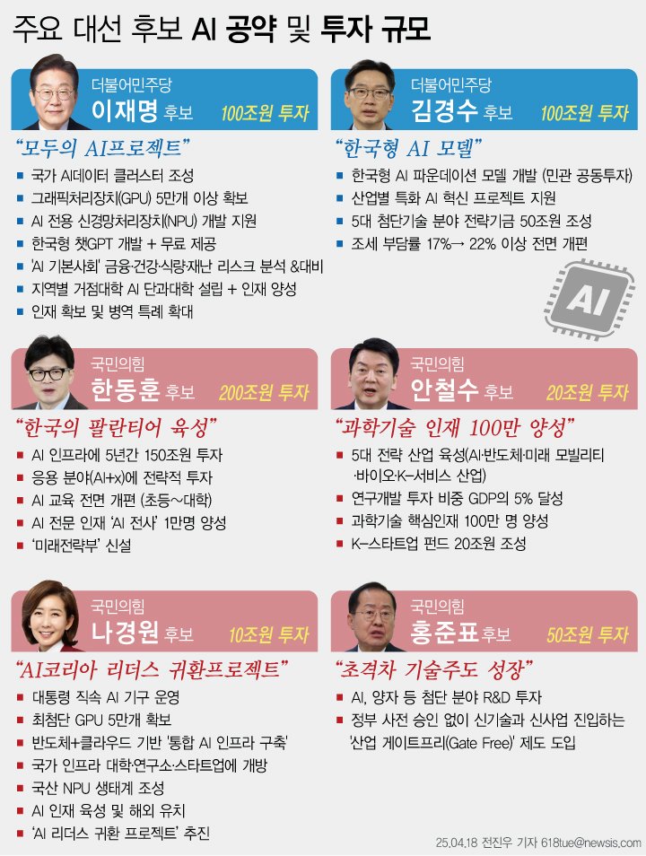 대선 후보들의 AI 공약은 대부분 대규모 투자와 국가 주도의 적극적인 개입을 통한 AI 강국 도약이라는 공통점을 갖고 있다. 이를 위해 적게는 수십조, 많게는 200조원을 AI에 투자하겠다는 공약을 경쟁적으로 펼치고 있다.