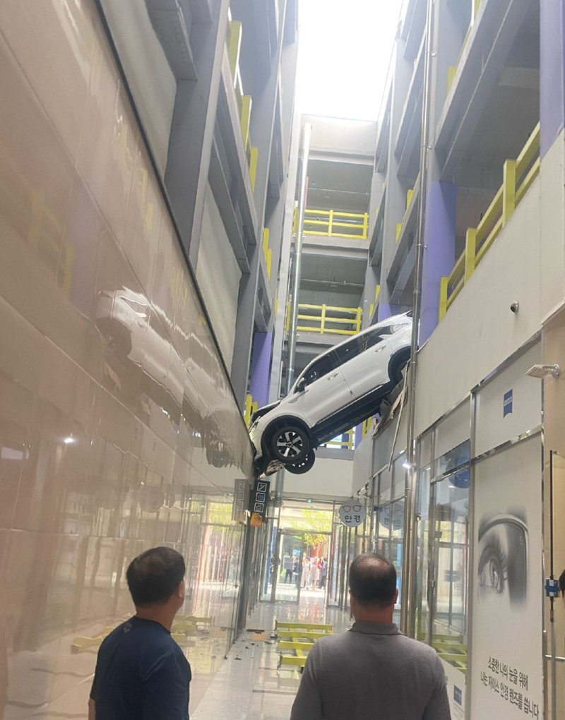 2층 펜스를 뚫고 돌진한 SUV는 건너편 주차장에 범퍼가 걸쳐지면서 추락으로 이어지지는 않았다.