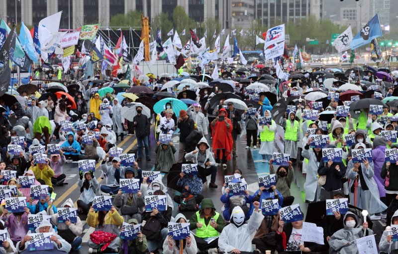 [서울=뉴시스] 김금보 기자 = 내란종식·사회대개혁 비상행동 회원들이 19일 서울 종로구 광화문 동십자각앞에서 '내란종식, 사대회대개혁을 위한 시민행진' 집회를 하고 있다. 2025.04.19. kgb@newsis.com [서울=뉴시스] 김금보 기자 = 19일 서울 종로구 광화문 동십자각 앞에서 '내란 종식, 사회 대개혁을 위한 시민행진' 집회가 열렸다.