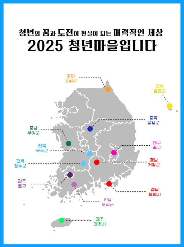 청년마을로 선정된 12곳은 대구 중구, 광주 동구, 강원 고성군, 충북 음성군, 충남 부여군, 전북 장수군·무주군, 전남 보성군, 경북 울릉군, 경남 통영시·거창군, 제주 제주시 등이다.