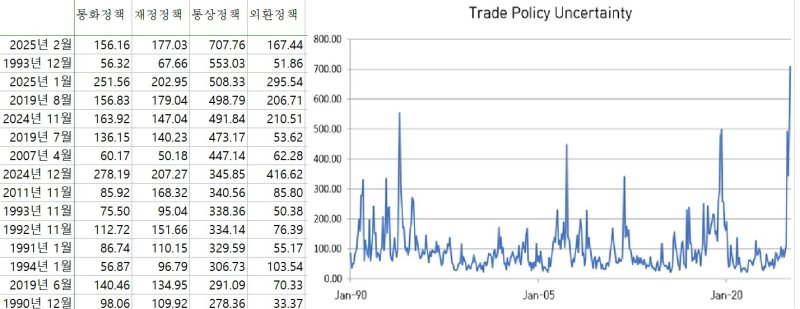 지난해 말과 올해 초를 제외하면, 통상 불확실성이 가장 높았던 시점은 △1993년 12월(553.03) △2019년 8월(498.79) △2007년 4월(447.13) △2011년 11월(340.56) 등이다. 최근 지수가 이보다 150~300포인트(p)가량 높다.