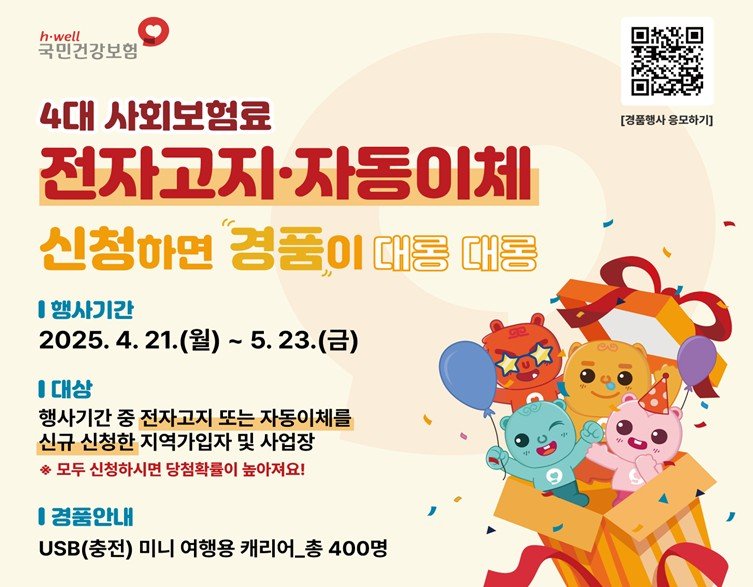 이번 경품 행사는 이날부터 5월 23일까지 진행되며 대상은 4대 사회보험료 전자고지와 자동이체를 신규 신청한 지역가입자 및 사업장이다.