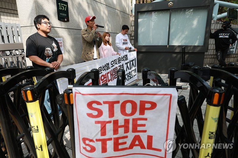윤 전 대통령 지지자 10여명은 재판 시작 1시간 전인 오전 9시께 동문 입구에서 '사전투표 폐지하라', '윤 어게인' 등이 적힌 피켓을 들고 윤 전 대통령의 복귀를 주장했다.