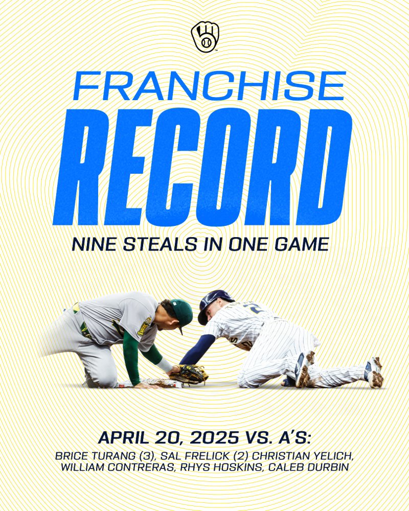 이날 9개의 도루를 추가한 밀워키는 팀 도루 33개를 기록, MLB 전체 1위로 올라섰다.