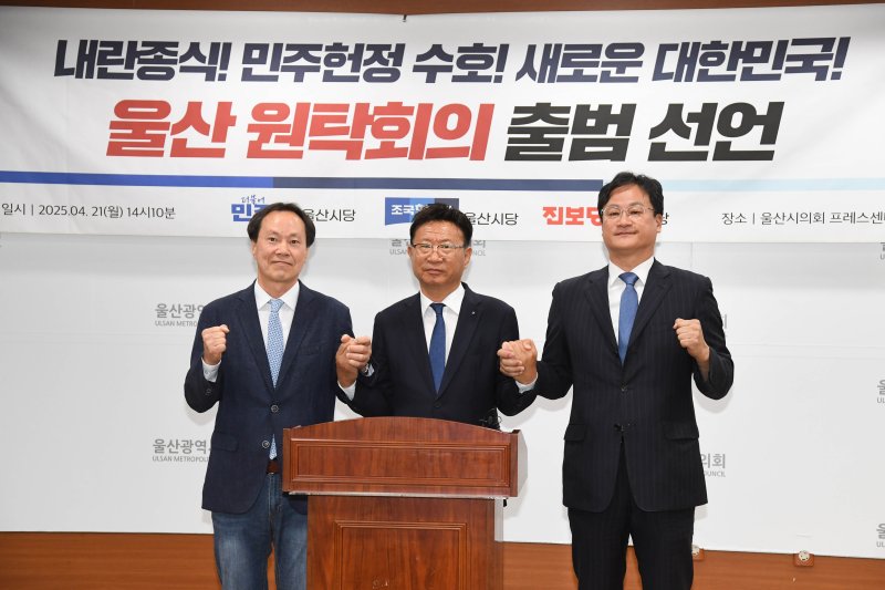 (울산=뉴스1) 김세은 기자 = 울산지역 진보 3당이 21일 오후 시의회 프레스센터에서 기자회견을 열고 ‘내란 종식! 민주헌정 수호! 새로운 대한민국 울산 원탁회의’ 출범을 선언했다.