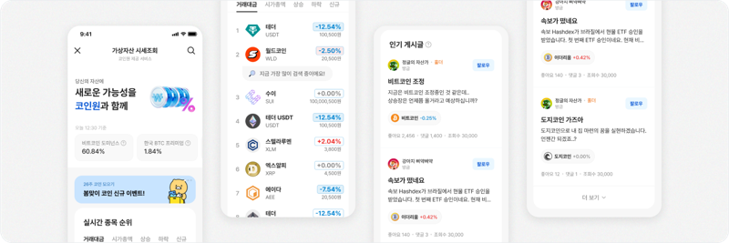 코인원 커뮤니티의 주요 콘텐츠도 제공된다. ‘실시간 손익 인증’ 영역에서는 최근 7일간 코인원 커뮤니티에 게시된 수익 및 손실 인증글 TOP3를 확인할 수 있다. 코인원 커뮤니티 내에서 높은 조회수를 기록한 게시글도 확인 가능하다.