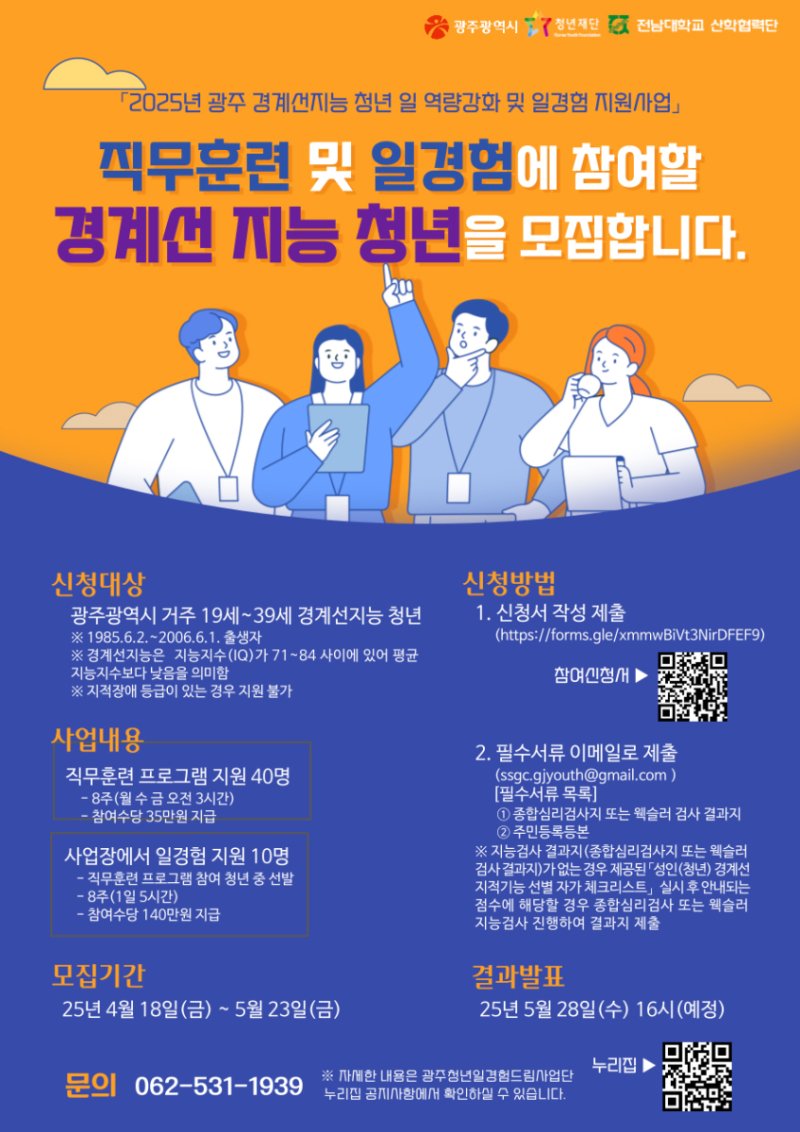 이 사업은 광주에 거주하는 19~39세(1985년 6월2일~2006년 6월1일 출생자) 경계선지능 청년을 대상으로 진로상담, 맞춤형 직무훈련 프로그램 및 일경험, 사회관계 능력향상을 위한 멘토링과 상담 등을 종합 지원한다.