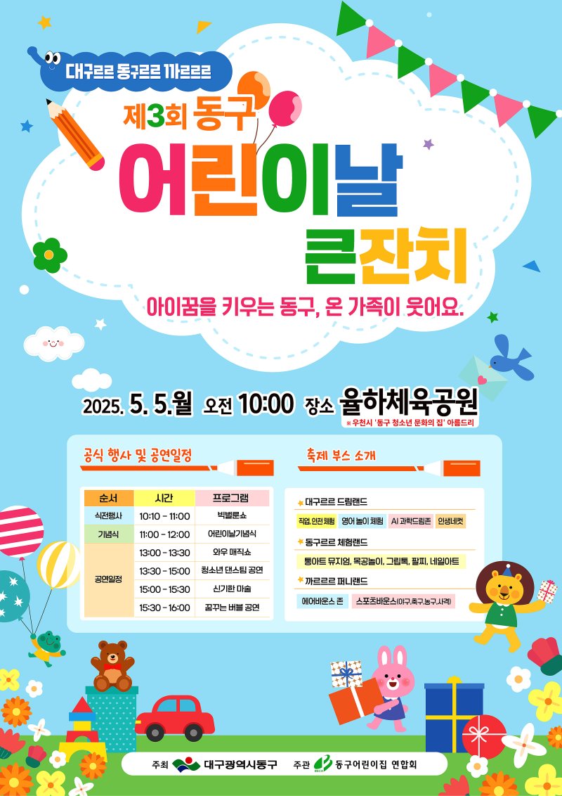 동구 관계자는 "다양한 놀거리와 볼거리를 제공해 온 가족이 웃으며 행복한 어린이날을 보낼 수 있도록 하겠다"고 말했다.