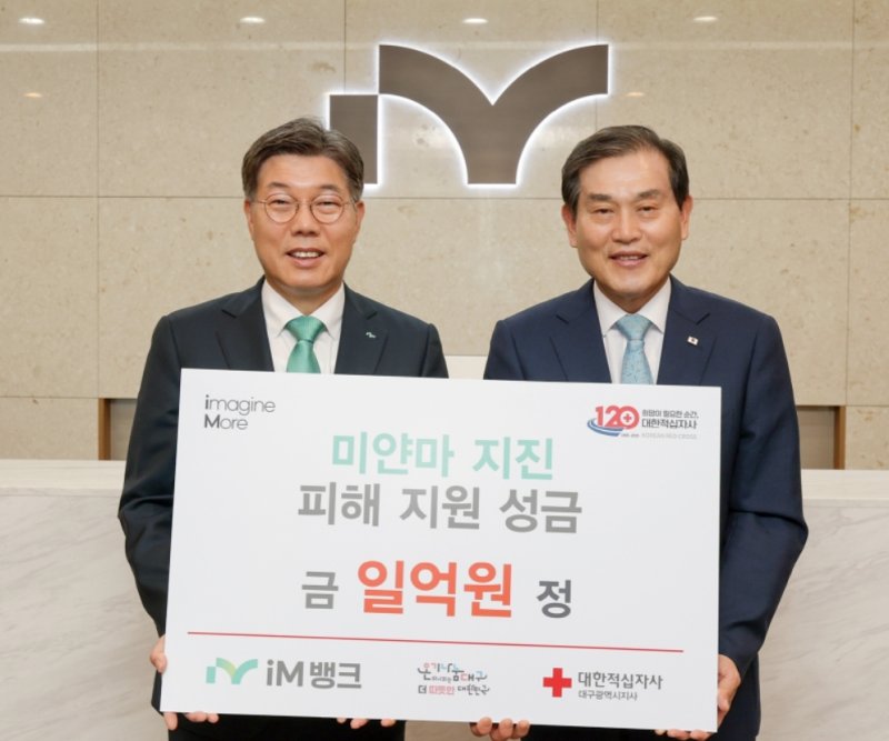 (대구=뉴스1) 김종엽 기자 = iM뱅크는 22일 지난달 발생한 미얀마 지진 피해복구 지원 기부금 1억 원을 대한적십자사 대구지사에 전달했다.