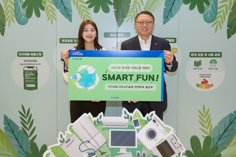 우리은행은 환경부 인증 비영리 공익법인 'E-순환거버넌스'와 업무협약을 체결하고 순환경제 활성화를 위한 다양한 사업을 추진 중이다. 캠페인 첫날 정진완 은행장은 직접 폐전자제품 기부에 참석해 자원순환 실천을 독려했다.