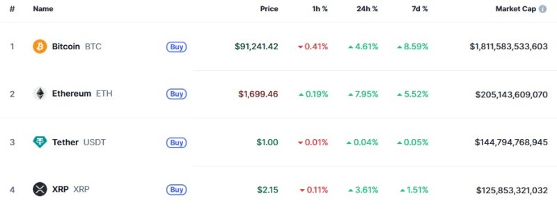 23일 오전 5시 50분 현재 글로벌 코인 시황 중계사이트인 코인마켓캡에서 비트코인은 24시간 전보다 4.61% 급등한 9만1241달러를 기록하고 있다. 비트코인이 9만1000달러를 재돌파한 것은 지난 3월 3일 이후 처음이다.