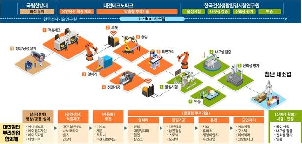 대전테크노파크는 공유팩토리 전체 운영 및 적층제조-후가공 통합공정을 총괄하고, 한국건설생활환경시험연구원은 부품시험평가 및 신뢰성 검증을, 국립한밭대학교는 적층제조 특화 형상 설계 및 공정 최적화를, 한국전자기술연구원은 효율적인 In-line 제조시스템 설계·구축을 맡는다.