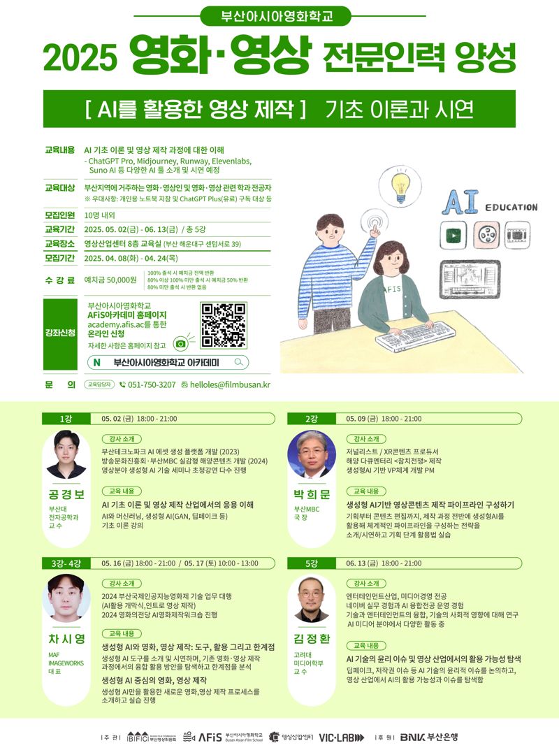 부산영상위원회 아시아영화학교(AFiS)는 올해 정규 교육과정인 ‘2025 영화·영상 전문인력 양성 프로그램’에 지역 영화인들을 위한 AI 분야 과목들을 편성했다고 23일 밝혔다.