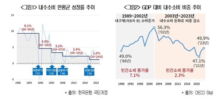 1988년부터 2024년까지 경제에 큰 충격을 준 4번의 사건을 기점으로 1988~1996년에는 9.1%였던 평균 소비 성장률이 1997년 외환위기 이후에는 4.5%(1997~2002년)로 낮아졌고, 2003년 카드대란 이후 3.1%(2003~2007년), 2008년 금융위기 이후에는 2.4%(2008~2019년)로 낮아졌다.
