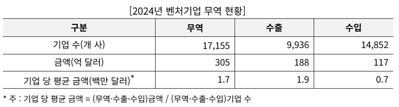 23일 벤처기업협회가 발표한 '2024년 벤처기업 무역동향'에 따르면 지난해 전체 벤처기업 3만7967개사 중 수출 또는 수입 실적이 있는 무역기업은 1만7155개사로 45.2%를 차지했다. 수출기업은 9936개사(26.2%), 수입기업은 1만4852개사(39.1%)로 집계됐다.