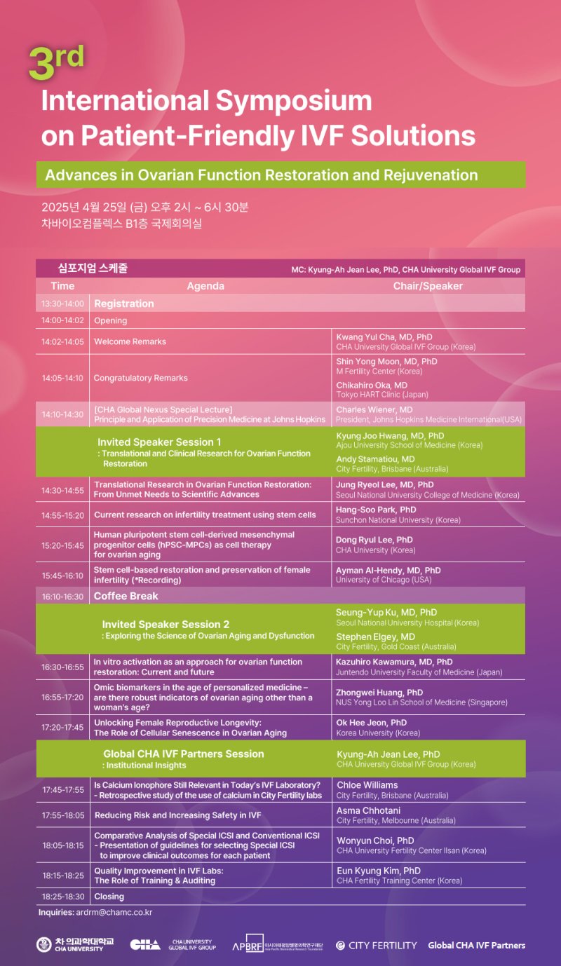 찰스 위너 미국 존스 홉킨스 국제의료 총장의 키노트 스피치를 시작으로 아이만 알 헨디 미국 시카고대학교 교수, 카즈히로 카와무라 일본 준텐도대학교 교수, 종웨이 황 싱가포르 국립대학교 교수 등이 발표한다. 국내·외 300명 이상의 난임 연구자가 모여 난소 기능 회복 및 줄기세포 치료 등에 대한 차세대 세포치료 전략 및 생식의학 분야의 미래를 선도할 방향성을 제시할 예정이다.