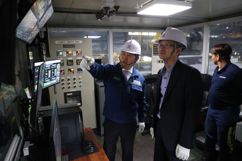 [파이낸셜뉴스] 백승보 조달청 차장(가운데)이 23일 경북 포항의 철근 생산업체인 ㈜화진철강을 찾아 철근 제조 현장을 모니터를 통해 확인하고 있다. 백 차장의 이날 업체 방문은 조달 현장의 어려운 점을 청취하고 철근 수급 상황을 점검하기위해 이뤄졌다.