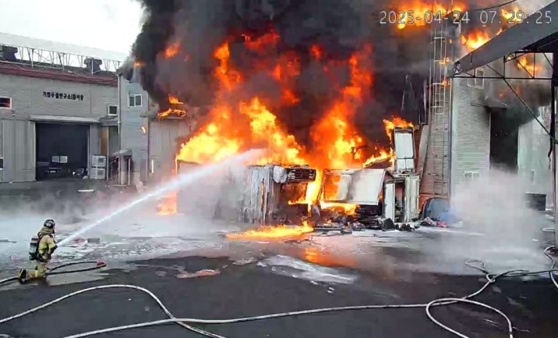 (화성=연합뉴스) 이영주 기자 = 24일 오전 7시 14분께 경기도 화성시 장안면 폐차장 폐유 보관 컨테이너에서 불이 나 44분 만에 초진됐다.