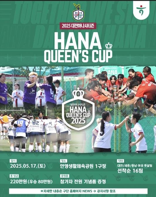 (서울=연합뉴스) 배진남 기자 = 프로축구 K리그1 대전하나시티즌이 여성 축구동호인 풋살대회인 '2025 하나퀸즈컵'을 개최한다.
