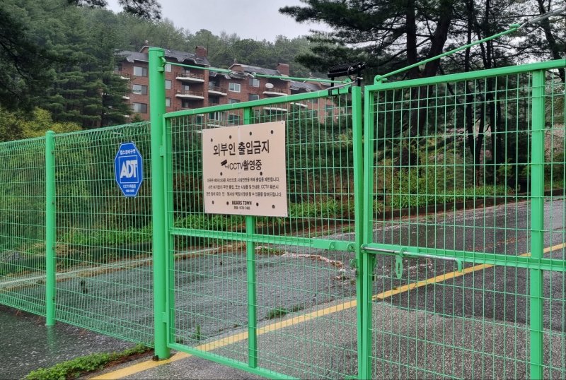 [포천=뉴시스] 김도희 기자 = '외부인 출입금지. 이곳은 베어스타운 자산으로 시설안전을 위해 출입을 제한합니다.'