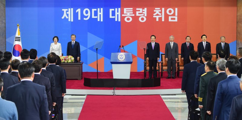 박 전 대통령 탄핵 후 당선된 문 전 대통령 취임식은 취임선서와 취임사 위주로 식순을 대폭 간소화했다. 보신각 타종행사 및 군악·의장대 행진과 예포 발사, 축하공연, 대형 무대 설비 설치 등을 생략하고 지정석도 따로 마련하지 않았다.