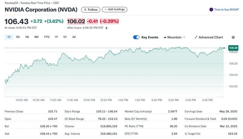 24일(현지시간) 뉴욕증시에서 엔비디아는 3.62% 급등한 106.43달러를 기록했다. 이로써 시총도 2조5970억달러로 불었다.