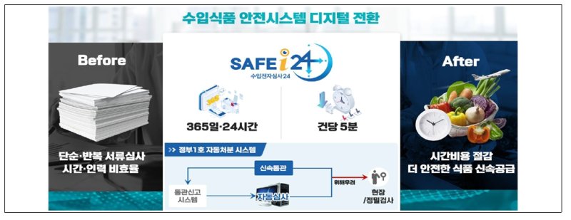'수입식품 전자심사24'는 사람이 하던 서류검사 업무를 디지털 심사로 전환해 수입식품 검사 행정의 효율성을 높이고 통관 시간·비용을 대폭 절감해 영업자의 부담을 해소하는 정책이다. 수입식품 전자심사24는 과거 검사 이력, 금지원료 사용 여부, 부적합 이력 등 2백여 개 항목을 검토해 수입신고 확인증까지 자동 발급하는 인공지능(AI) 기반 검사시스템이다.