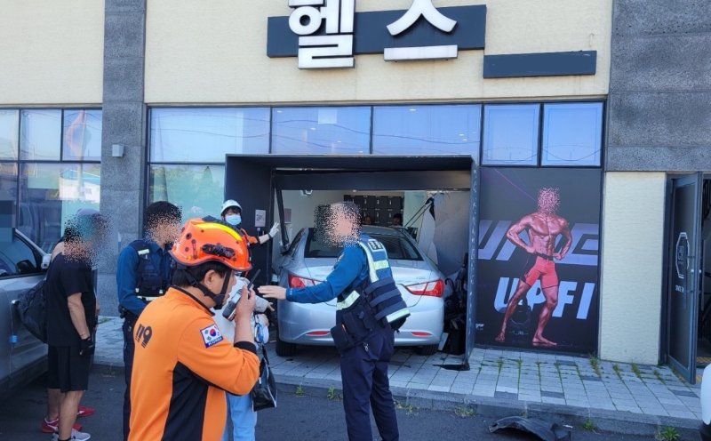 [제주=뉴시스] 우장호 기자 = 25일 오후 3시35분께 제주시 외도동에서 60대 여성 A씨가 몰던 소나타 승용차량이 헬스장 건물 안으로 돌진했다.