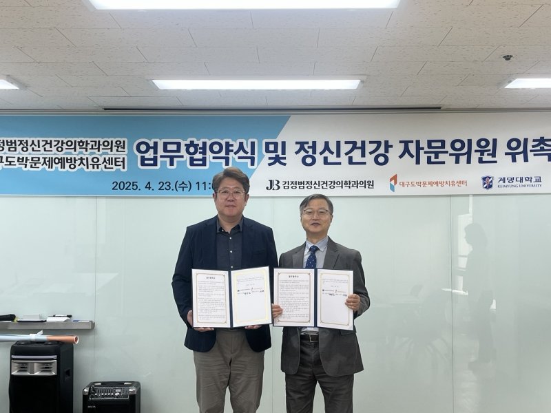 [대구=뉴시스] 이상제 기자 = 대구도박문제예방치유센터는 정신건강 자문위원 위촉·운영을 위해 김정범정신건강의학회의원, 위드병원과 업무협약을 체결했다고 25일 밝혔다.