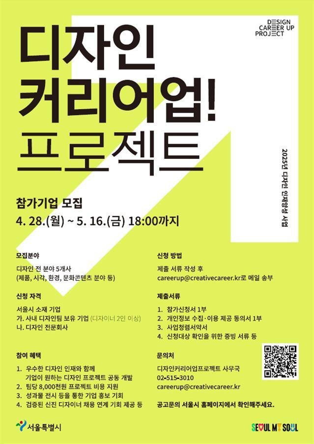 (서울=뉴스1) 이설 기자 = 서울시는 디자인 관련 학과 졸업 후 5년 이내 미취업한 신진 디자이너와 주요 기업을 매칭해주는 '디자인 커리어업 프로젝트(Design Career Up Project)'를 새롭게 추진한다고 27일 밝혔다.