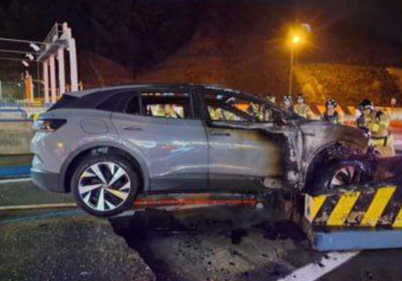 [용인=뉴시스] 변근아 기자 = 27일 오전 1시14분 경기 용인시 수지구 용인서울고속도로 서울 방향 서수지톨게이트를 통과하던 폭스바겐 SUV 전기차가 연석을 들이받았다.