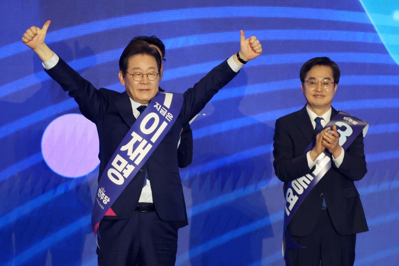 [고양=뉴시스] 조성우 기자 = 이재명(왼쪽) 더불어민주당 대선 경선 후보가 27일 경기도 고양시 킨텍스에서 열린 제21대 대통령 선거 후보자 선출을 위한 수도권·강원·제주 합동연설회에서 지지자들에게 인사하고 있다. 오른쪽은 김동연 경선 후보. 2025.04.27. xconfind@newsis.com <저작권자ⓒ 공감언론 뉴시스통신사. 무단전재-재배포 금지.> /사진=뉴시스화상