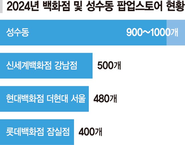 '팝업 성지' 성수동은 지난해 월평균 80~90개의 팝업스토어가 열린 것으로 추산된다. 1년간 1000개 안팎의 팝업이 진행된 셈이다. 팝업 고객들이 몰리면서 지난해 하루 평균 성수역 이용자만 8만8059명에 달했다. 백화점업계 관계자는 "마니아층이 두꺼운 캐릭터, 아이돌 등 지식재산권(IP)을 활용한 팝업스토어는 집객효과가 굉장히 크다"며 "백화점에 입점한 브랜드가 비슷하다 보니 이색적인 팝업스토어를 통해 차별화하는 추세가 뚜렷하다"고 말했다.