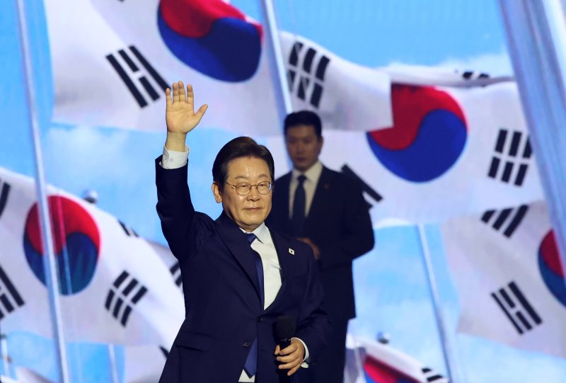 [고양=뉴시스] 조성우 기자 = 더불어민주당 제21대 대통령 선거 후보에 선출된 이재명 후보가 27일 경기도 고양시 킨텍스에서 열린 제21대 대통령 선거 후보자 선출을 위한 수도권·강원·제주 합동연설회에서 수락연설을 하기 전 손을 들어 인사하고 있다. 2025.04.27. xconfind@newsis.com [서울=뉴시스]김진아 조성우 김지은 기자 = 이재명 전 더불어민주당 대표가 27일 역대 최고 득표율인 89.77%의 지지를 받으며 민주당 제21대 대선 후보로 선출됐다. 이 전 대표는 "지금 이 순간부터 이재명은 민주당의 후보이자 내란 종식과 위기극복, 통합과 국민 행복을 갈망하는 모든 국민의 후보"라며 "국민의 명령을 받아 반드시 승리하겠다"고 밝혔다.