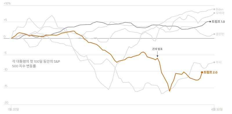 2기 임기가 시작된 이후 4월 23일 기준 S&P500은 거의 11% 하락해 다른 주요국들에 비해 더 나쁜 성적을 나타냈다. 같은 기간 유럽 스톡600지수는 1.4% 하락하는 데에 그쳤고 미국과 무역전쟁을 막 시작한 중국의 블루칩 CSI300 지수도 1%대로 떨어지는 데에 그쳤다.