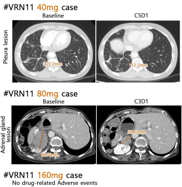 효능 평가 결과 기존 표준 치료요법으로 치료한 후 C797S 돌연변이가 나타난 환자를 대상으로 VRN11 40㎎를 투약한 결과 4주 후 종양이 40% 이상 감소했다. Del19 돌연변이 환자를 대상으로 80㎎를 활용해 치료한 3주 후에는 종양이 20% 이상 줄었다.