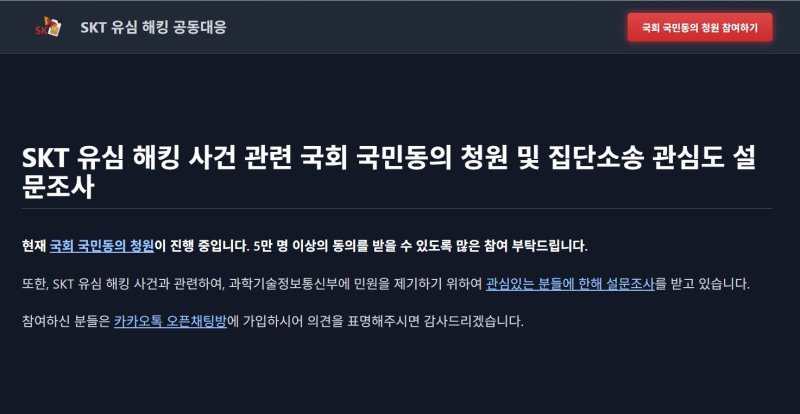 28일 오전 기준 'SKT 유심 해킹 공동 대응' 홈페이지에는 집단소송 의견을 묻는 설문조사와 국회 국민 동의 청원 링크가 표출된다. 카카오톡 오픈채팅방 링크도 함께 표시된다.