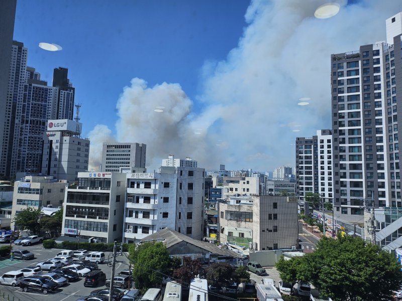 (대구=뉴스1) = 28일 오후 2시 1분쯤 대구 북구 노곡동 함지산에 불이 나 연기가 중구 동인동 중구청사에서 보이고 있다. 2025.4.28/뉴스1 /사진=뉴스1화상
