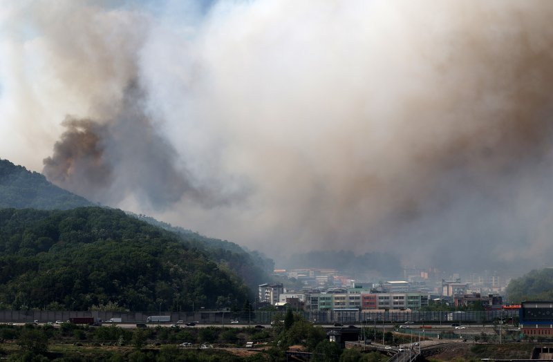 산불 진화율은 이날 오후 5시30분 15%다. 산불영향구역은 92㏊로 추정됐다. 총 화선은 6.5㎞ 중 0.9㎞를 진화 완료하고 5.6㎞를 진화 중이다